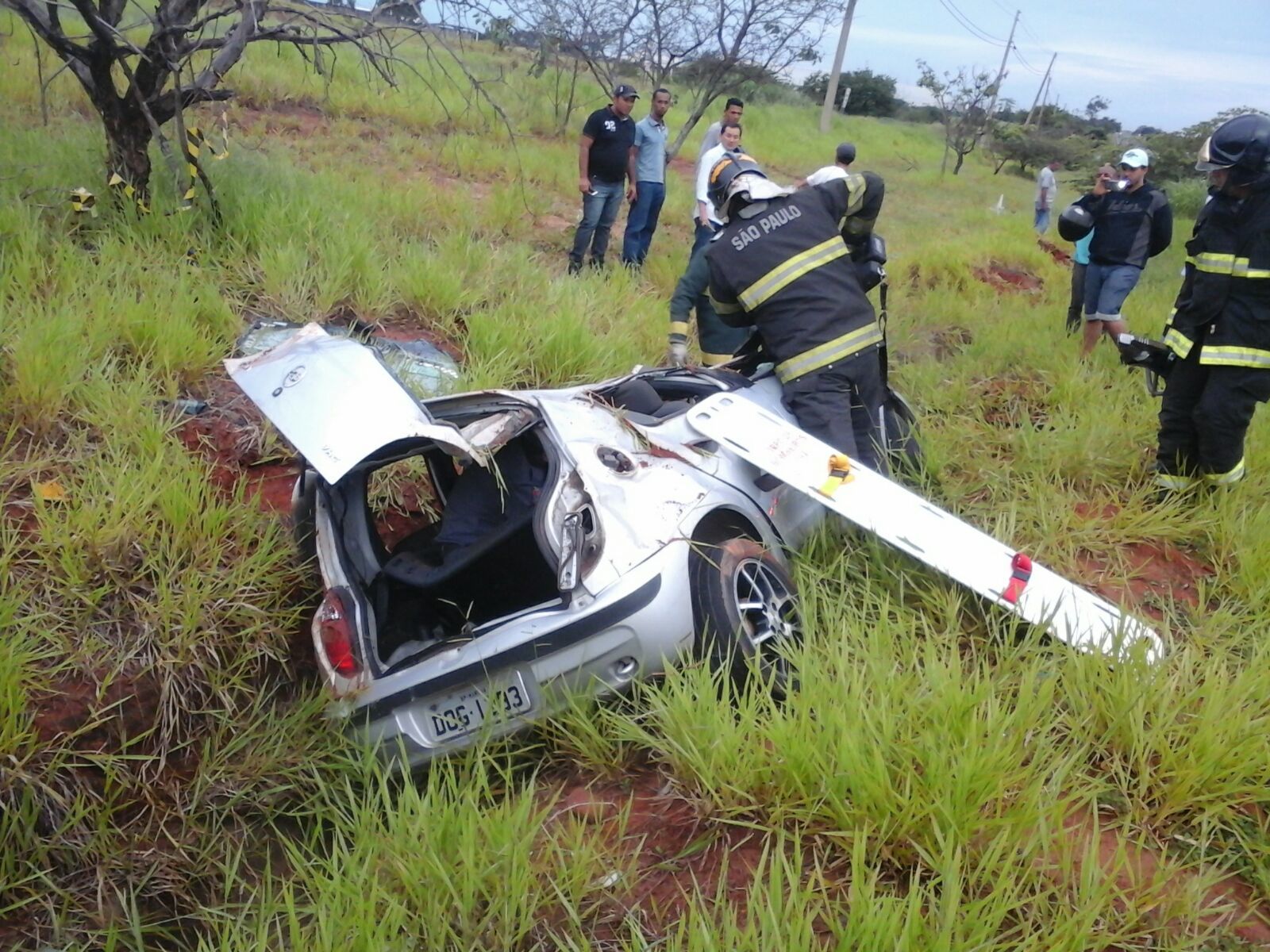 O carro teria batido na canaleta de concreto e capotado algumas vezes até parar além do acostamento.