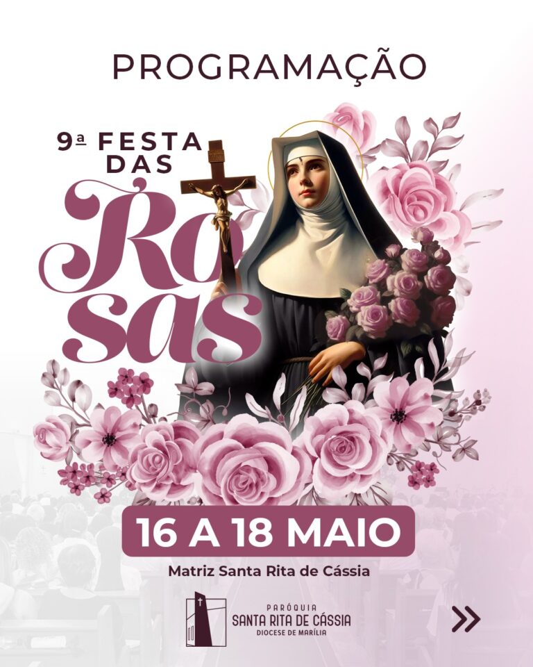 Começa na noite desta sexta-feira (16) e segue até o domingo (18) a 9ª edição da tradicional Festa das Rosas, na Paróquia Santa Rita de Cássia, zona sul de Marília. A quermesse vai contar com grande variedade de produtos típicos, programação especial e momentos de espiritualidade.