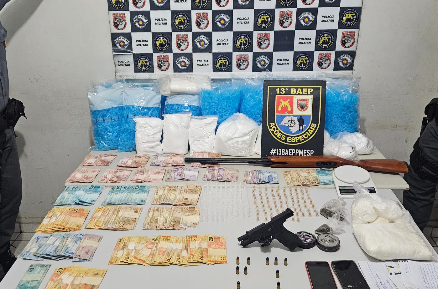 Além disso, os cães farejadores Seth e Kaia, do canil do Baep, auxiliaram os policiais na localização de diversos itens relacionados ao tráfico de drogas, incluindo entorpecentes que somaram 5,5 quilos, entre maconha (3,5 quilos), cocaína (1,2 quilo) e crack (800 gramas).