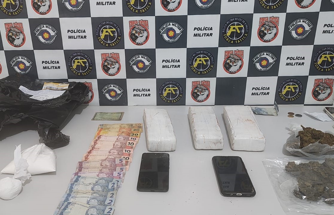 Ao realizarem a abordagem no imóvel, os policiais militares localizaram três tijolos de maconha, que haviam sido jogados para o lado externo, além de duas porções de cocaína, uma porção de skunk e R$ 155.