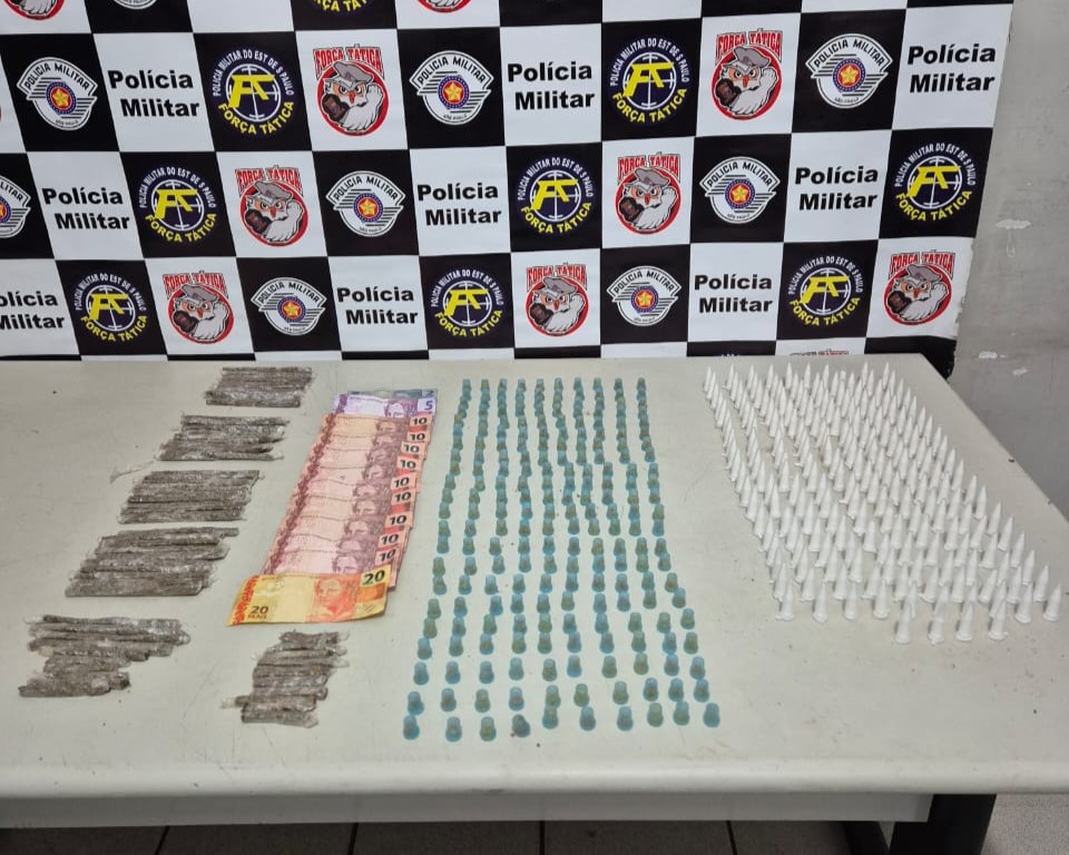 Ao todo, foram apreendidos 194 microtubos de cocaína, 220 porções de crack e 60 porções de maconha, totalizando mais de 750 gramas de drogas.
