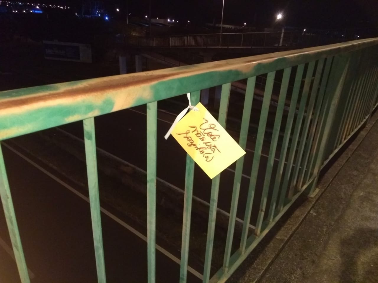 “Você não está sozinho” é a frase de uma das mensagens em papéis amarelos amarrados na grade de proteção. “Sua vida é preciosa” e “você não é caso perdido” são outros escritos.