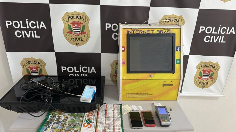 A busca foi acompanhada pelo proprietário, um comerciante de 55 anos. No interior do estabelecimento, foram apreendidas uma máquina caça-níquel, um aparelho TV Box com software modificado para vídeo bingo, duas máquinas de cartão adulteradas para jogos ilegais e seis cadernos com anotações de apostas.