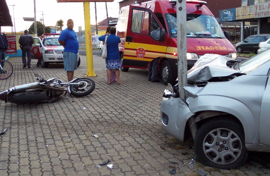 O automóvel, um Fiat Uno, também bateu contra um poste, onde ficou enroscado e teve a frente toda comprometida.