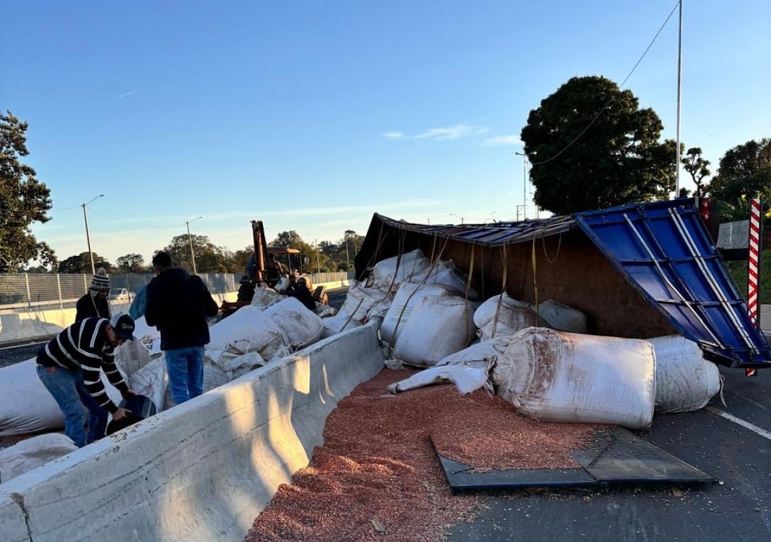 Um acidente envolvendo uma carreta carregada com 31 toneladas de amendoim, na manhã desta terça-feira (13), causou interdição parcial e lentidão na rodovia Rachid Rayes (SP-333), próximo a Echaporã. O veículo atingiu a barreira de concreto entre as pistas. Ninguém ficou ferido.