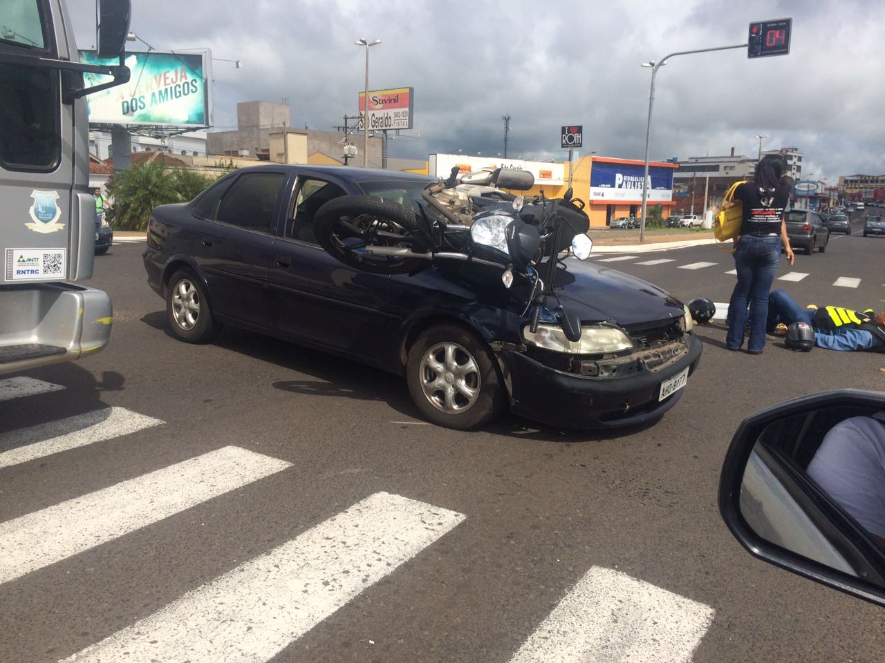 O caso chamou a atenção e mobilizou o equipes de resgate e a Polícia Militar. A motocicleta ficou presa no para-brisas do automóvel.