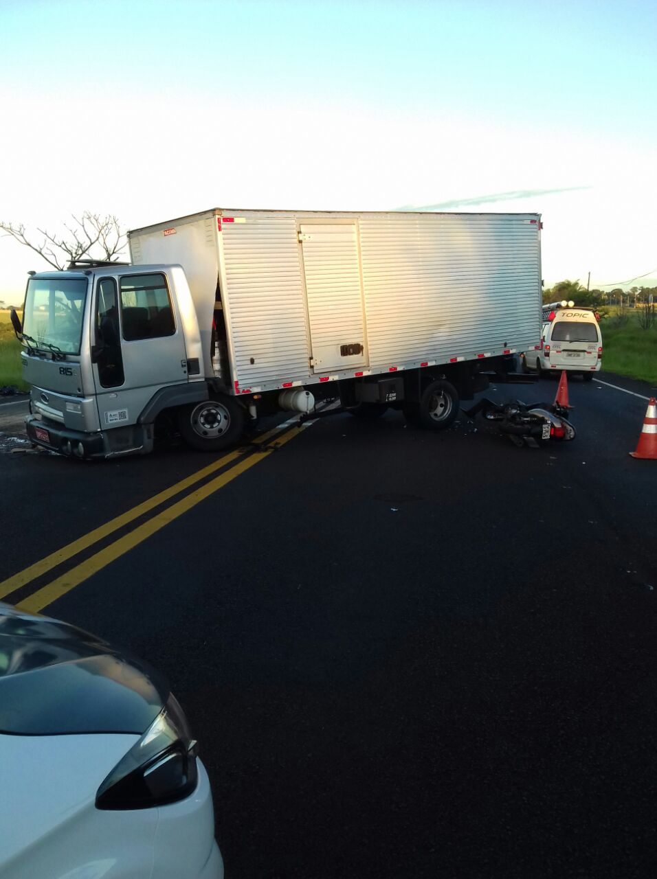 Mais um carro acabou se envolvendo na batida e um motociclista também. A moto foi parar debaixo do caminhão.