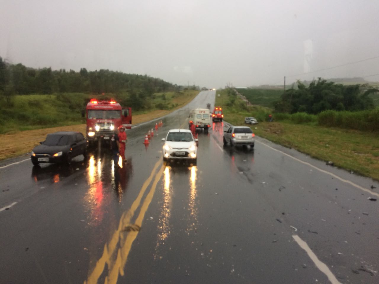 Um dos carros envolvidos teria caído em uma ribanceira, segundo as informações iniciais. No local do acidente a pista estava molhada pela chuva. Parte da rodovia ficou interditada para circulação.