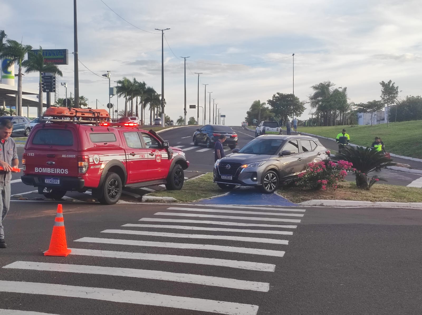 Um acidente na manhã desta terça-feira (27) chamou a atenção de quem passava pelo cruzamento entre a avenida Sanches Cibantos e a rua Manoel Muller, na zona norte da cidade. Um veículo foi parar sobre um canteiro da via, após colisão com uma viatura do Corpo de Bombeiros.