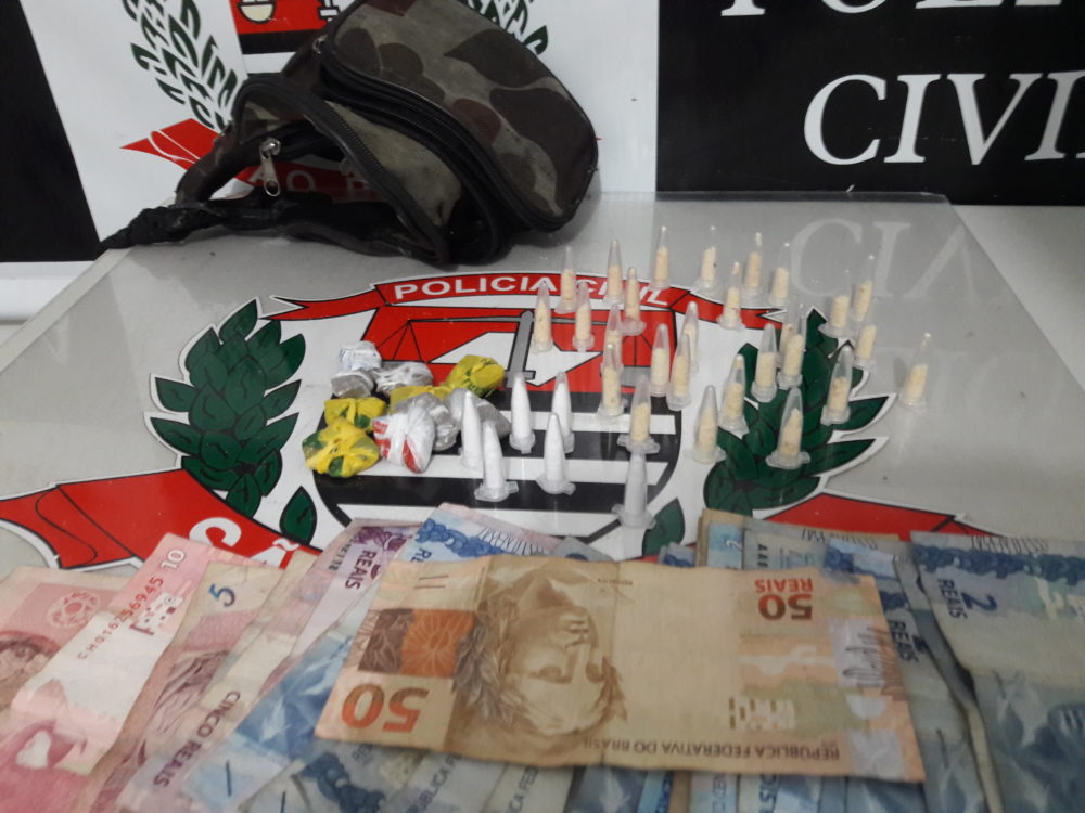 Foram apreendidos 27 pinos com crack, seis porções de maconha e 10 de cocaína, além da quantia de R$ 163 em notas diversas.