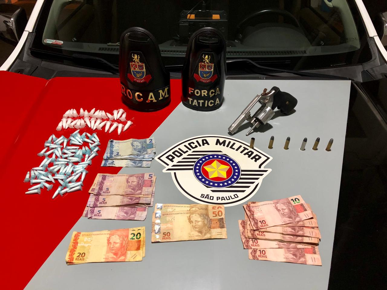 O suspeito foi levado ao plantão policial onde registrado o flagrante referente aos atos infracionais de porte ilegal de arma de fogo e tráfico de entorpecentes.