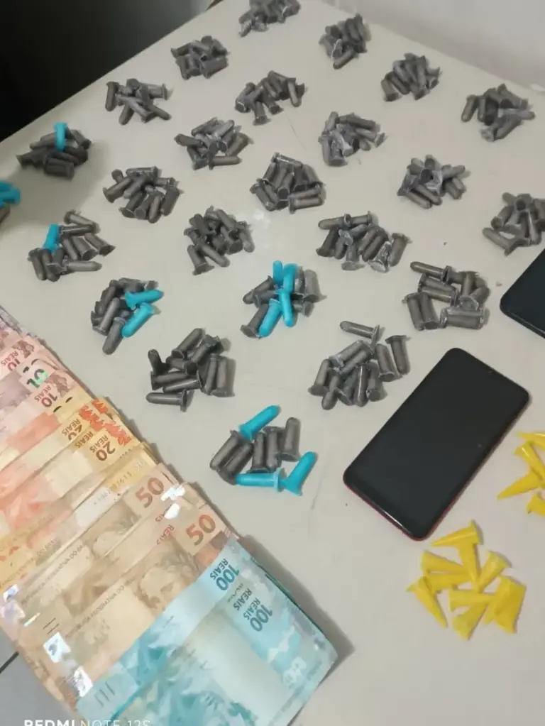 Durante a revista pessoal, os PMs encontraram com ele duas sacolas com drogas e dinheiro. No total, foram apreendidos 476 pinos com crack, 248 pinos com cocaína e R$ 1.842, além de dois celulares. Um dos telefones seria de um usuário de drogas.