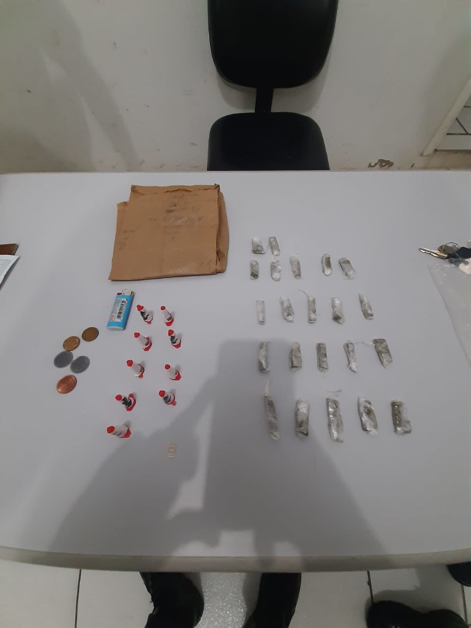 O menor foi abordado no complexo habitacional do CDHU. Em sua posse havia um saco de papel contendo 22 porções de maconha e nove pinos com cocaína, além de algumas moedas.