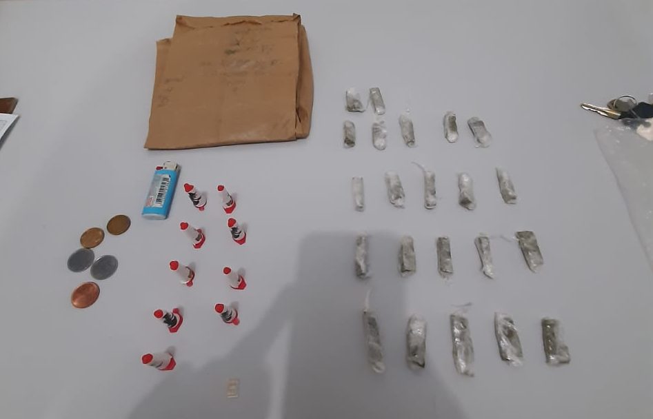 O menor foi abordado no complexo habitacional do CDHU. Em sua posse havia um saco de papel contendo 22 porções de maconha e nove pinos com cocaína, além de algumas moedas.
