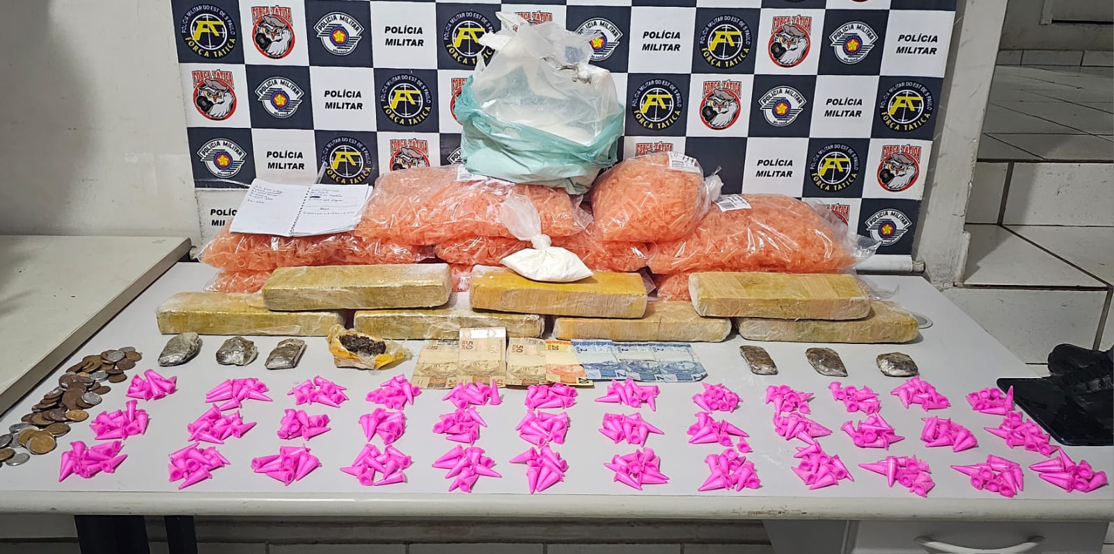 Depois, ele também levou os policiais até uma casa abandonada onde guardava mais sete tijolos de maconha, duas porções de cocaína, um caderno de contabilidade, sete sacos e meio de pinos vazios e um aparelho celular.