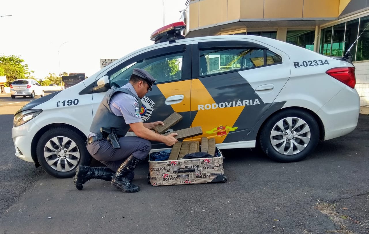 Ao vistoriar sua bagagem no compartimento externo do ônibus, foram localizados em seu interior oito tabletes de maconha. O total da droga pesou 7,550 quilos.