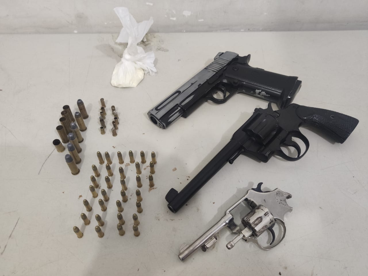 Debaixo de uma cômoda, no quarto do adolescente, havia um revólver calibre 22, uma caixa contendo inúmeras munições de mesmo calibre, sendo 32 íntegras e 11 deflagradas e ainda diversas munições calibre 38. Também foi localizado um saco contendo pó semelhante a pólvora e uma arma falsa.