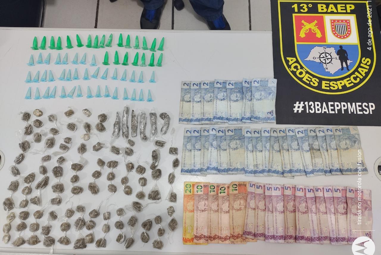 O rapaz foi detido em área de mata e os policiais observaram quando ele dispensou duas sacolas. Com o menor foram encontrados dez pinos com cocaína, dez pinos com crack e dez porções de maconha, além de R$ 166.