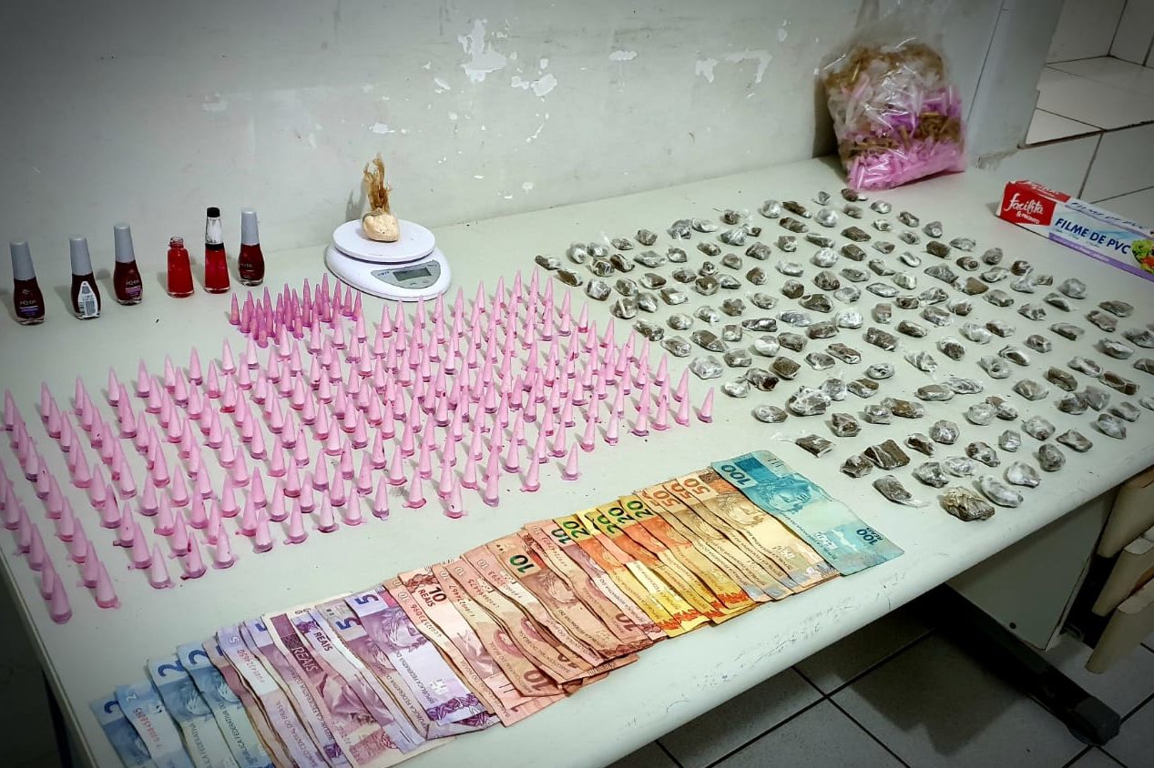 Com ele foram encontrados 155 porções de maconha, 234 porções de cocaína, 24 porções de crack e R$ 665, além de uma balança de precisão e um pacote com pinos vazios.