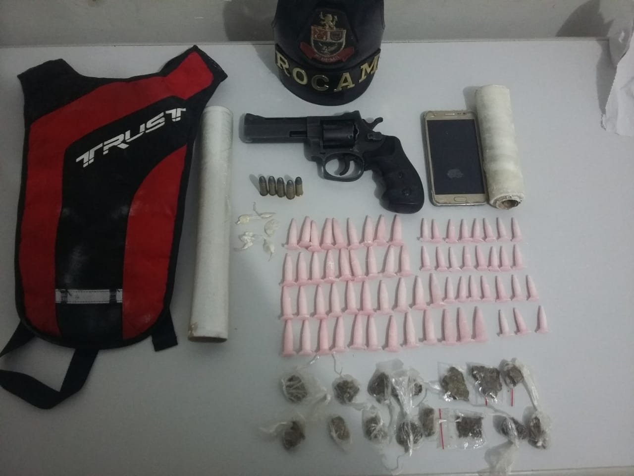 Um menor de 17 anos foi detido por policiais militares da Ronda Ostensiva com Apoio de Motocicletas (Rocam) após ser flagrado com uma arma de fogo e porções de crack, cocaína e maconha na noite desta quarta-feira (26) na favela do Argolo Ferrão, zona Oeste de Marília.