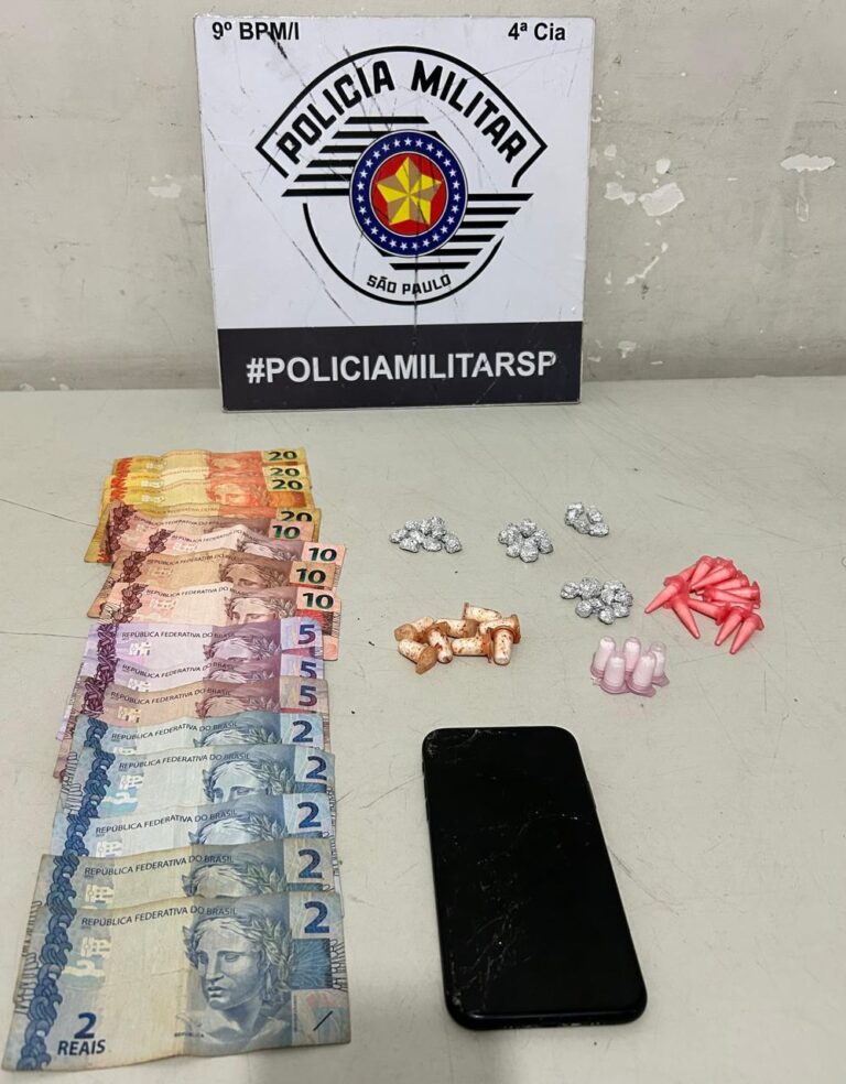 Na abordagem, foram encontrados com ele R$ 145 em notas diversas e um aparelho celular. Na embalagem, os agentes localizaram 13 pinos com cocaína e dez pedras de crack embaladas em papel alumínio.