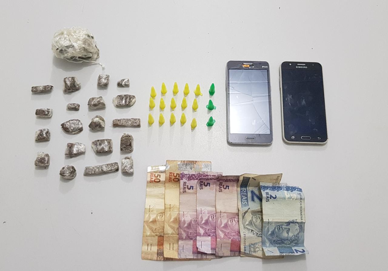 Com o maior de idade foram localizados 15 pinos com cocaína, uma porção de maconha, três porções de crack e R$ 105 em dinheiro.