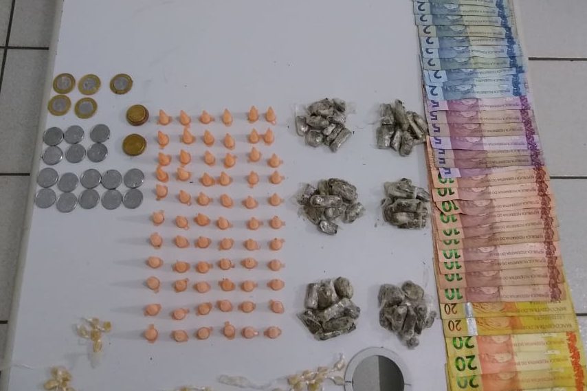 Com o outro havia 14 pinos com cocaína, 22 porções de maconha, 153 pedras de crack e R$ 675.