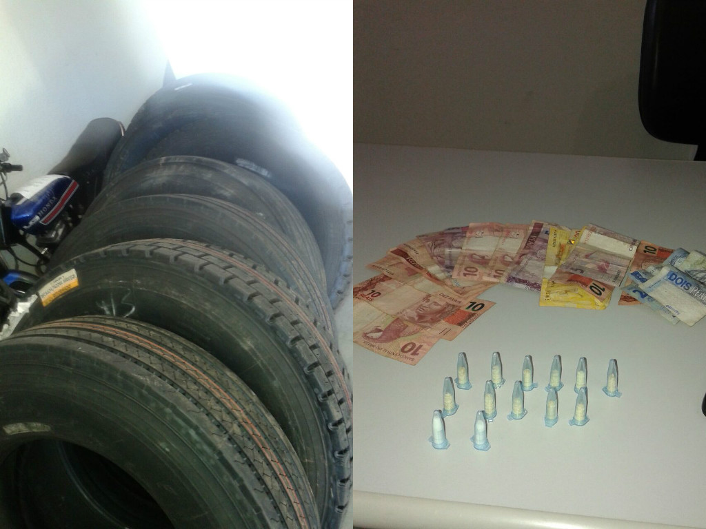 A residência é usada também para o tráfico de entorpecentes. Foram apreendidos 11 pinos com crack, dois com cocaína, R$ 191 em dinheiro e os pneus que foram furtados.