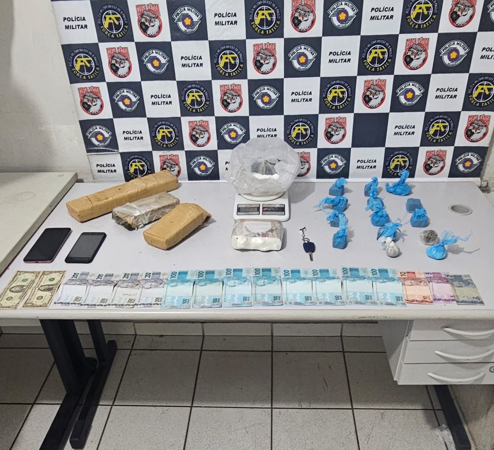 No imóvel, a polícia encontrou três tijolos de maconha, um tijolo de cocaína, um saco com a mesma droga e uma balança.