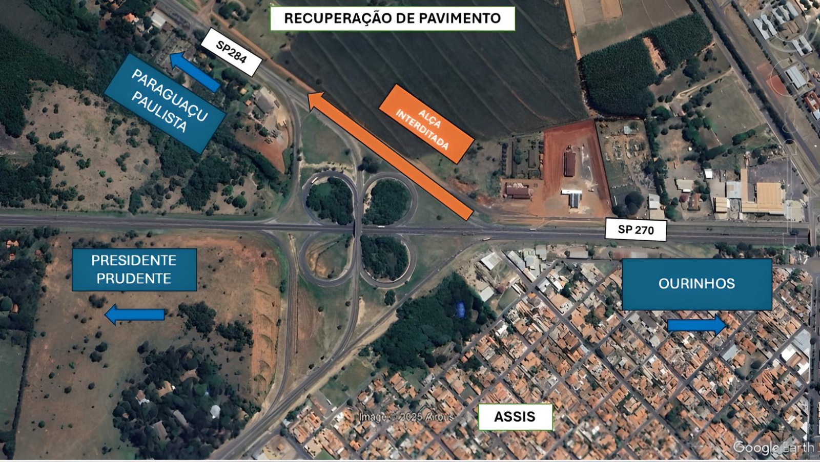 A alça de acesso à rodovia Manilio Gobbi (SP-284), em Assis, será interditada nesta segunda-feira (28), das 7h às 18h, para a execução de obras de recuperação do pavimento. O trecho faz a ligação com a rodovia Raposo Tavares (SP-270), no sentido Paraguaçu Paulista.