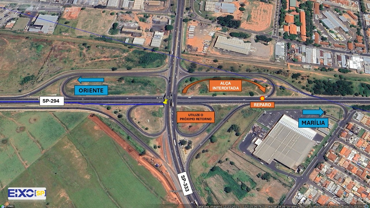 A Eixo SP realiza neste sábado (29) interdição da alça que faz a ligação da rodovia Dona Leonor Mendes de Barros (SP-333) com a Comandante João Ribeiro de Barros (SP-294), no dispositivo localizado próximo ao supermercado Atacadão.