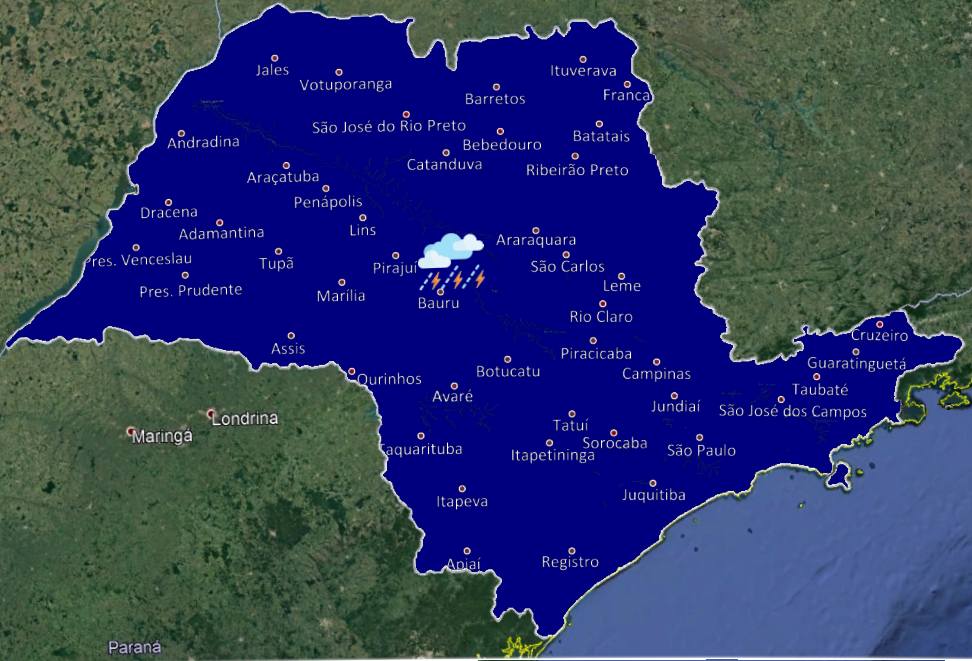 O Instituto de Pesquisas Meteorológicas (IPMet) da Universidade Estadual Paulista (Unesp), aponta 73% de chance de chuvas a partir das 15h. No fim do dia a probabilidade sobe para 86%.