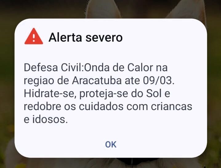 Aparelhos de celular de Marília receberam na manhã desta sexta-feira (7) comunicado da Defesa Civil do Estado de São Paulo de “alerta severo” de “onda de calor na região de Araçatuba até 9/3”, referindo-se a este próximo domingo.