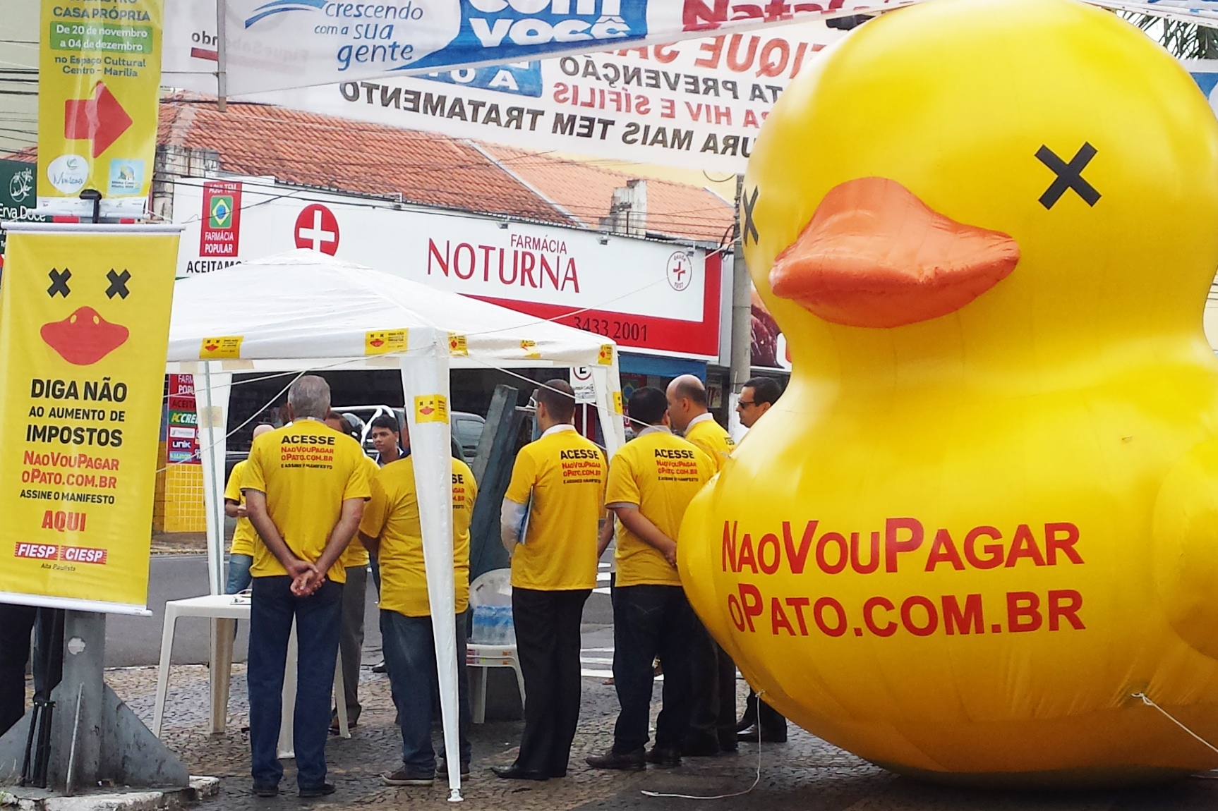 O artefato foi levado ao local pelo Centro das Indústrias do Estado de São Paulo (Ciesp) da Alta Paulista. A cerimônia marcou o lançamento na cidade da Campanha “Não Vou Pagar o Pato”, contra a criação e aumento de impostos propostos pelo governo.