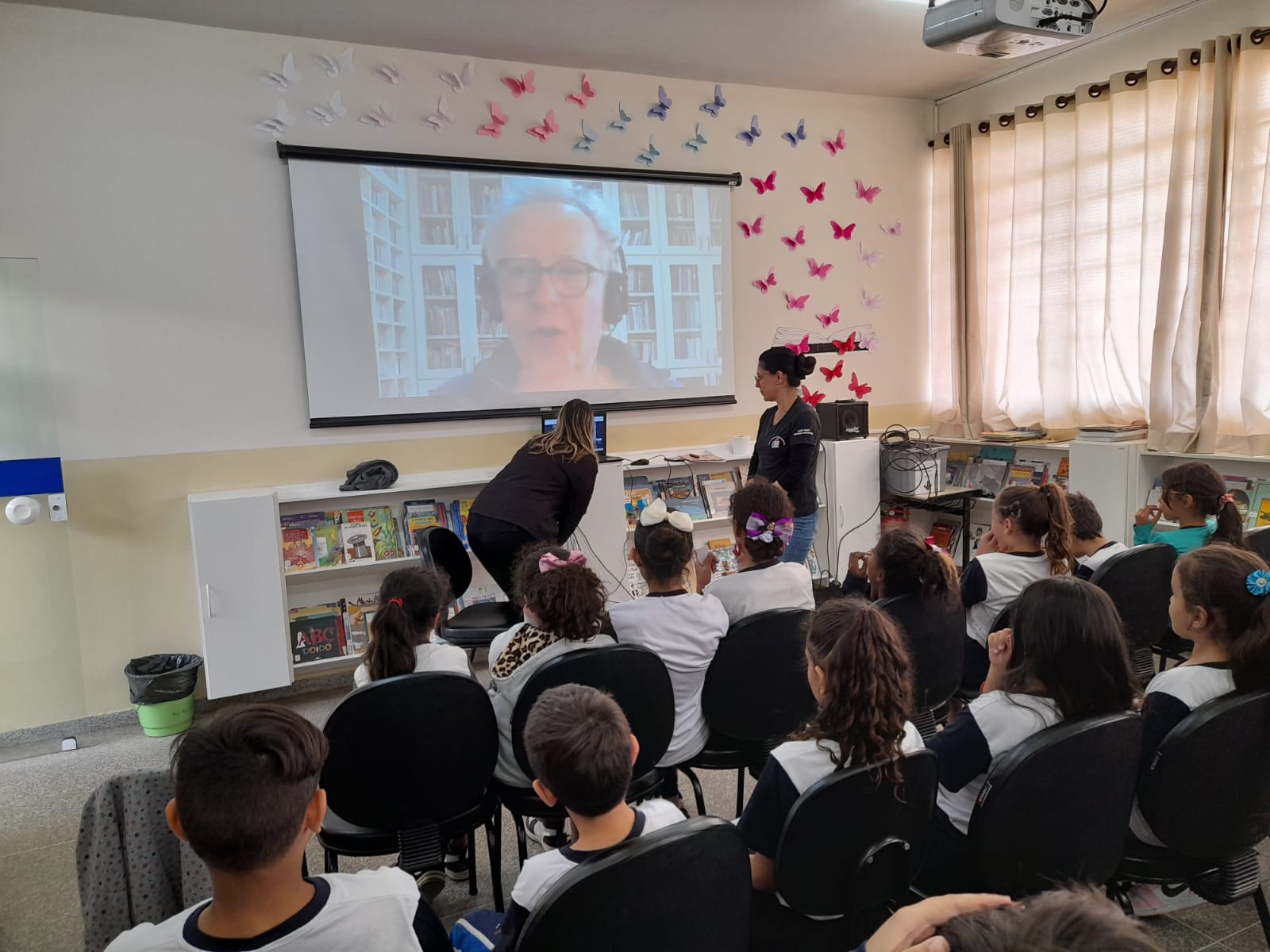 A videoconferência foi realizada na biblioteca da escola e contou com a participação de outras turmas, tendo sido acompanhada pela supervisora de ensino, Rita de Cássia Borguetti Pelozo, pela diretora da escola, Glauce Montoro Chaves, pela auxiliar de direção, Flávia Simone Rodolfo da Silveira e pelas coordenadoras, Cristiane Caliman Bordini e Yngrid Karolline Mendonça Costa.