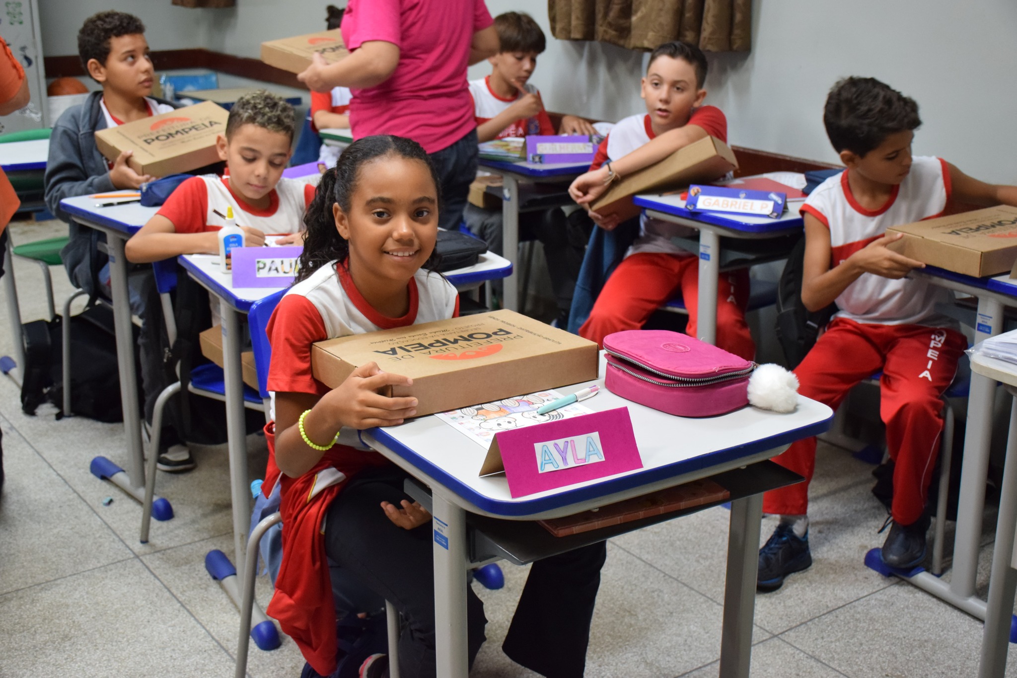 Logo no primeiro dia de aula, os pequenos pompeianos receberam os tradicionais kits escolares com com cadernos, lápis, borrachas, apontador, régua, caixa de lápis de cor e outros itens.