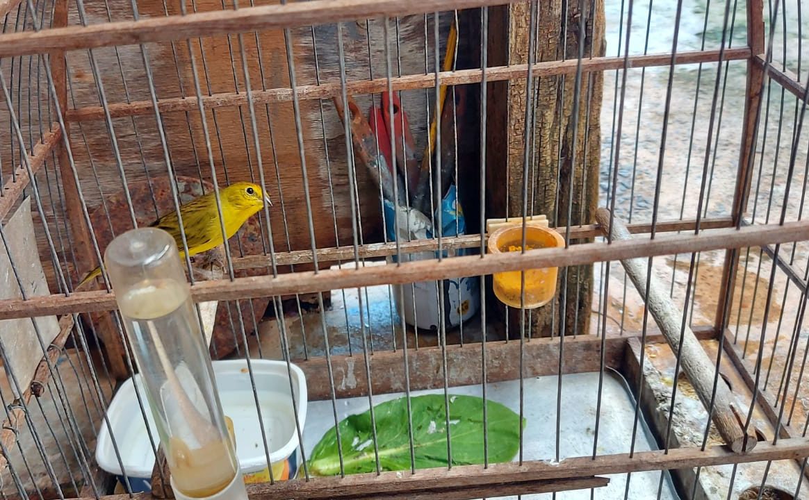 Durante patrulhamento, a Polícia Ambiental viu uma gaiola na garagem de uma casa, com uma ave silvestre nativa da espécie canário-da-terra.
