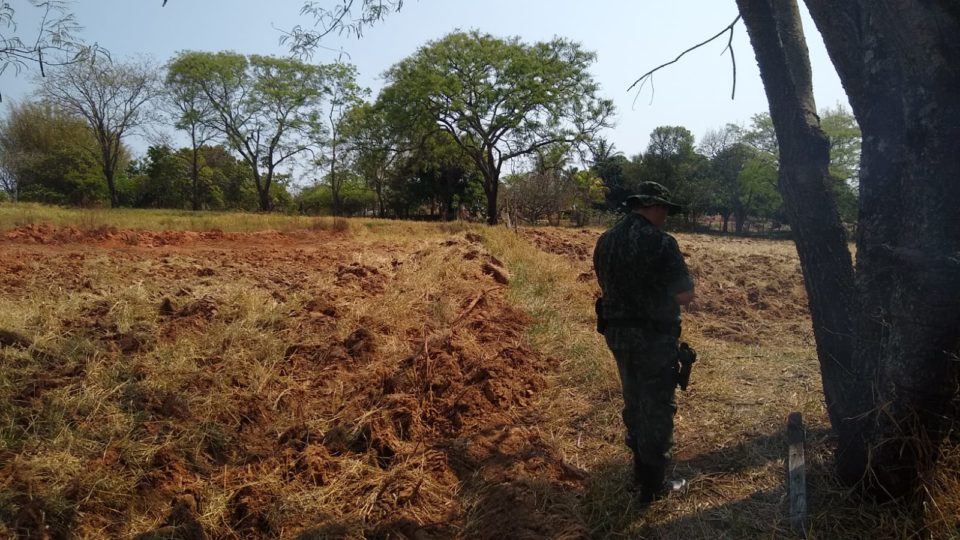 A Polícia Ambiental atendeu denúncia sobre intervenção em Área de Preservação Permanente (APP) – borda de tabuleiro – , e constatou que a ação ocorreu por meio de implementos agrícolas (gradeamento) em 0,439 hectares.