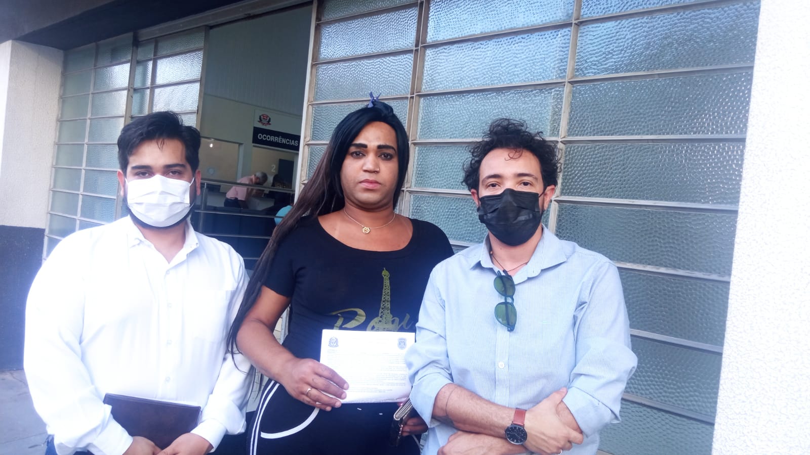 Advogado André Lisque, Kelly Fernandes e Cin Falchi após o registro do boletim de ocorrência na CPJ em Marília (Foto: Divulgação)