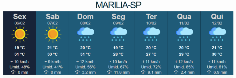 A previsão do clima em Marília indica aumento da nebulosidade neste fim de semana e retorno das chuvas nos próximos dias. As informações são do Instituto de Pesquisa Meteorológica (IPMet) de Bauru, que aponta para a chamada “virada do tempo” após um período de calor intenso e predomínio de sol.