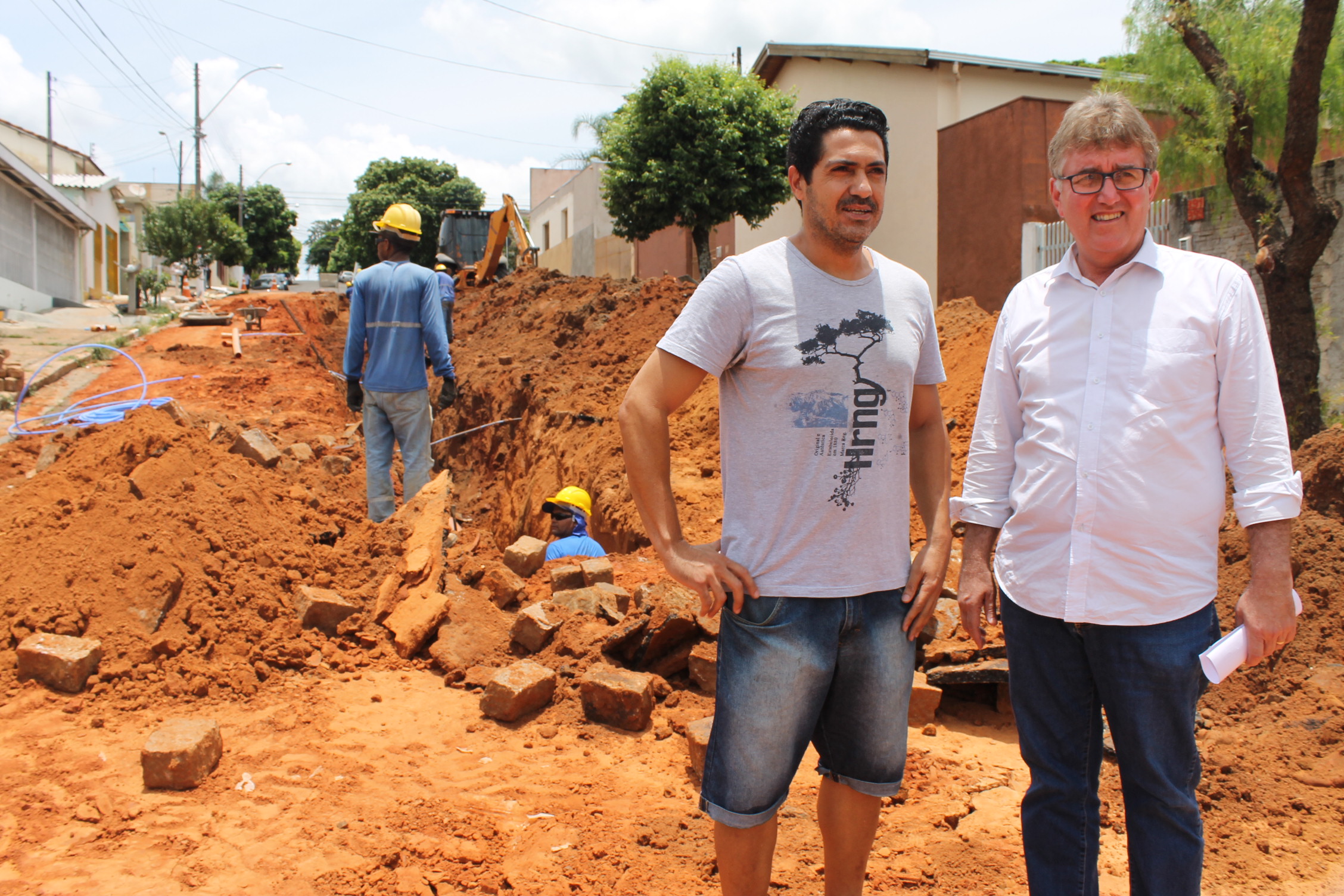 O presidente Marcos Rezende e o morador Luiz Bernardi durante visita às obras da rua Rui Barbosa. (Foto: Ramon Barbosa Franco)