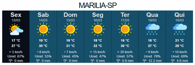 Após uma semana marcada por chuvas intensas e transtornos em diferentes regiões da cidade, o fim de semana em Marília deve ter tempo firme e temperaturas em elevação. A previsão é do Instituto de Pesquisas Meteorológicas (IPMet), conforme atualização divulgada nas últimas horas.