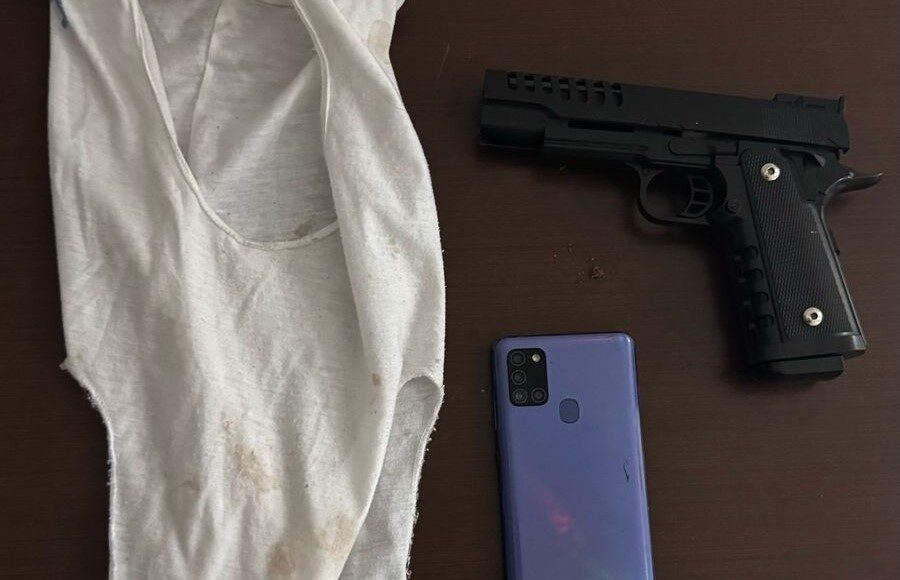 Durante a busca pessoal, os agentes localizaram, na cintura do abordado, uma réplica de arma de fogo e uma touca tipo balaclava (touca ninja) de tecido fino.