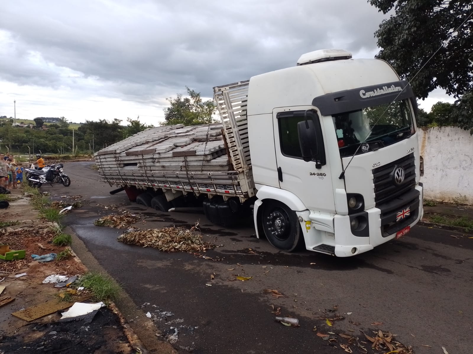 A cratera que se abriu sob o eixo traseiro, no lado direito da carroceria, escondeu grande parte da roda. Um veículo da Prefeitura foi acionado para auxiliar na operação, que foi lenta devido a carga.