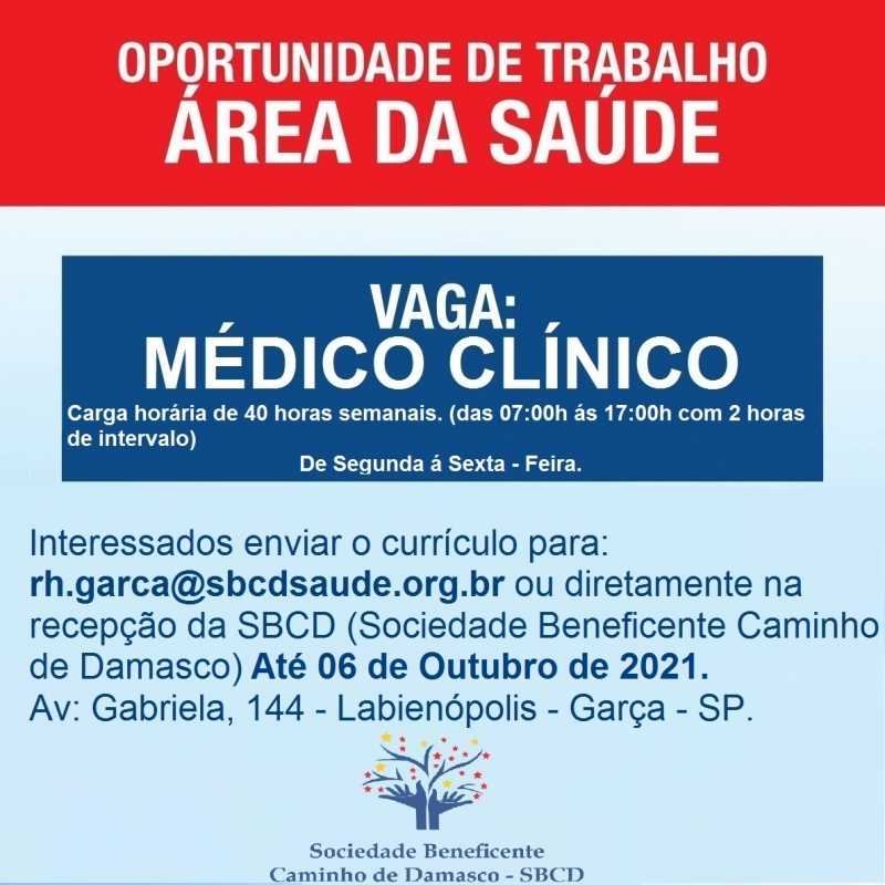 A Sociedade Beneficente Caminho de Damasco (SBCD), parceira da Prefeitura de Garça (distante 35 quilômetros de Marília), na gestão dos serviços de atenção básica no município, está com vaga aberta para a contratação de médico clínico.
