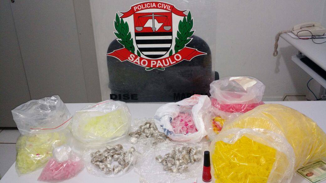 Na lavanderia do apartamento foram encontrados microtubos vazios, que acondicionariam mais drogas, junto a um vidro de esmalte da cor indicada. Também foram apreendidas 75 porções de maconha.