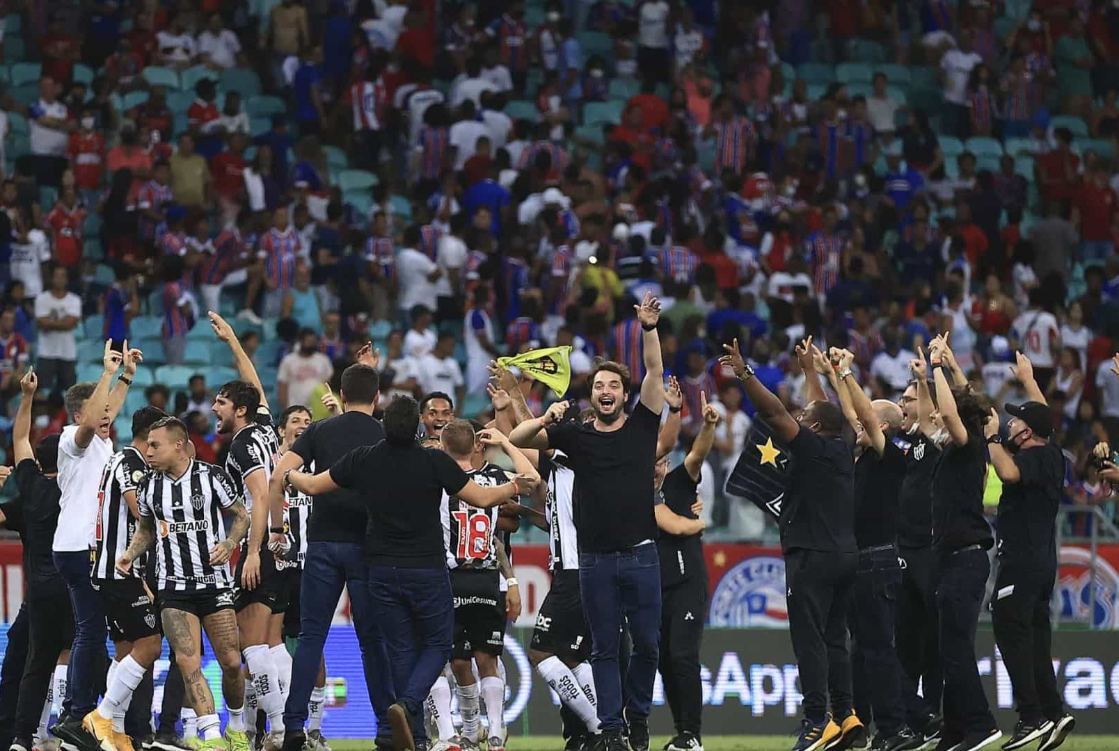 O treinador do Bahia mexeu para tentar buscar novamente a vitória e viu Keno receber de Nathan para novo chutaço e uma incrível virada em cinco minutos. Cuca fechou a “casinha” com mais um defensor e contou com boas defesas de Everson para acabar com o mais longo jejum de títulos de um grande no Brasileirão. Uma festa linda e de quem mais mereceu.