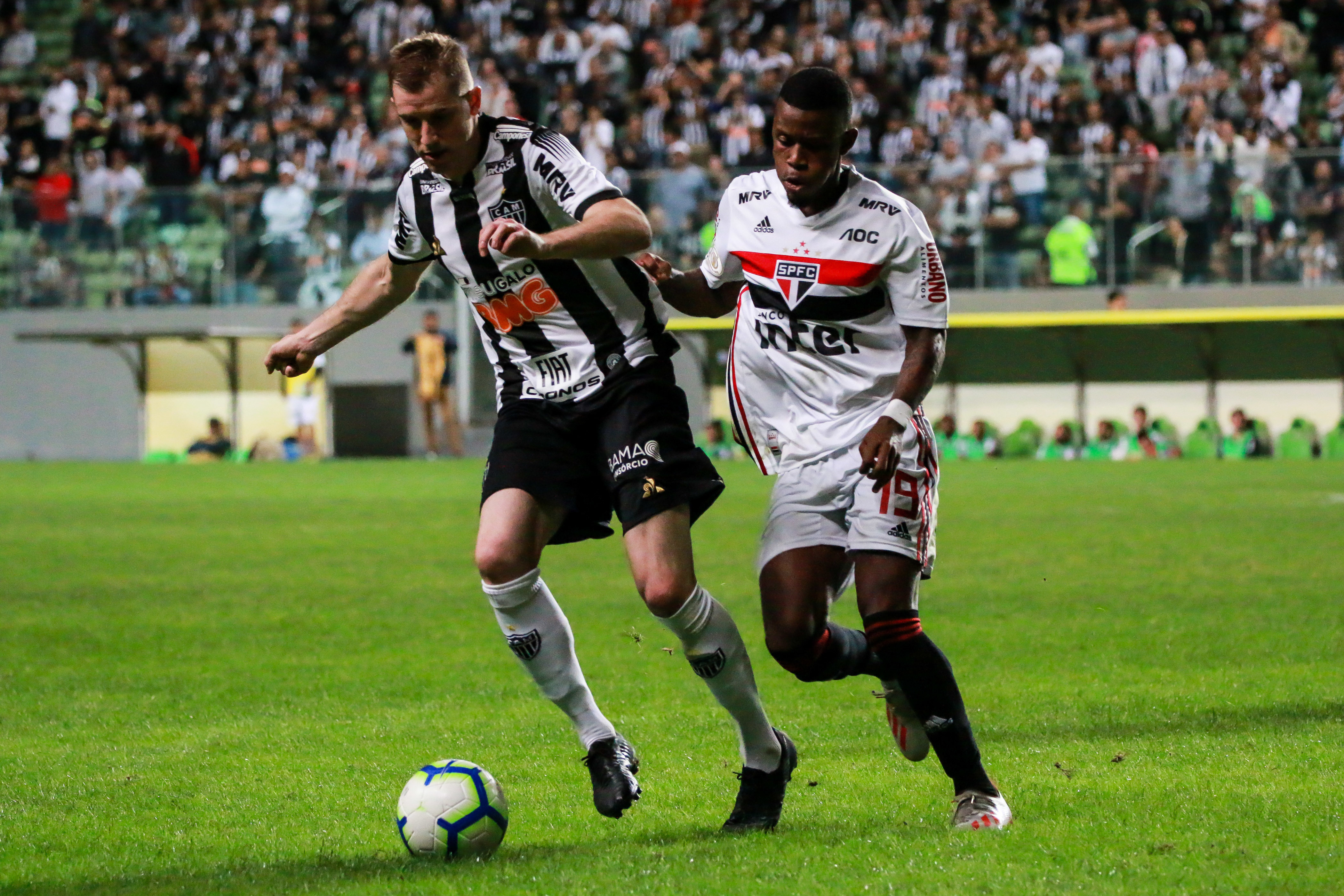 MG - ATLÉTICOMG/SÃOPAULO - GERAL - Adilson, do Atlético-MG, é marcado por Calazans, do São Paulo, durante Atlético-MG x São Paulo, partida válida pela nona rodada do Campeonato Brasileiro 2019, realizada na Arena Independência, Belo Horizonte, MG. 13/06/2019 - Foto: DUDU MACEDO/FOTOARENA/FOTOARENA/ESTADÃO CONTEÚDO