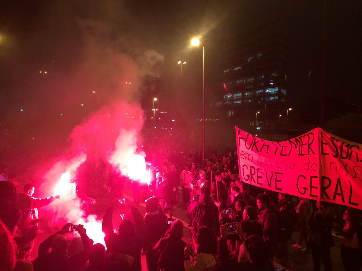 Um ato em frente à casa do presidente Michel Temer em São Paulo nesta sexta-feira, 28, foi dispersado após um confronto entre polícia e manifestantes. Por volta das 20h30, a PM começou a atirar bombas de efeito moral contra os manifestantes mais próximos da barreira montada no local para isolar a residência do presidente. Houve correria em direção às ruas vizinhas. A polícia usou bombas, balas de borracha e canhão de água.