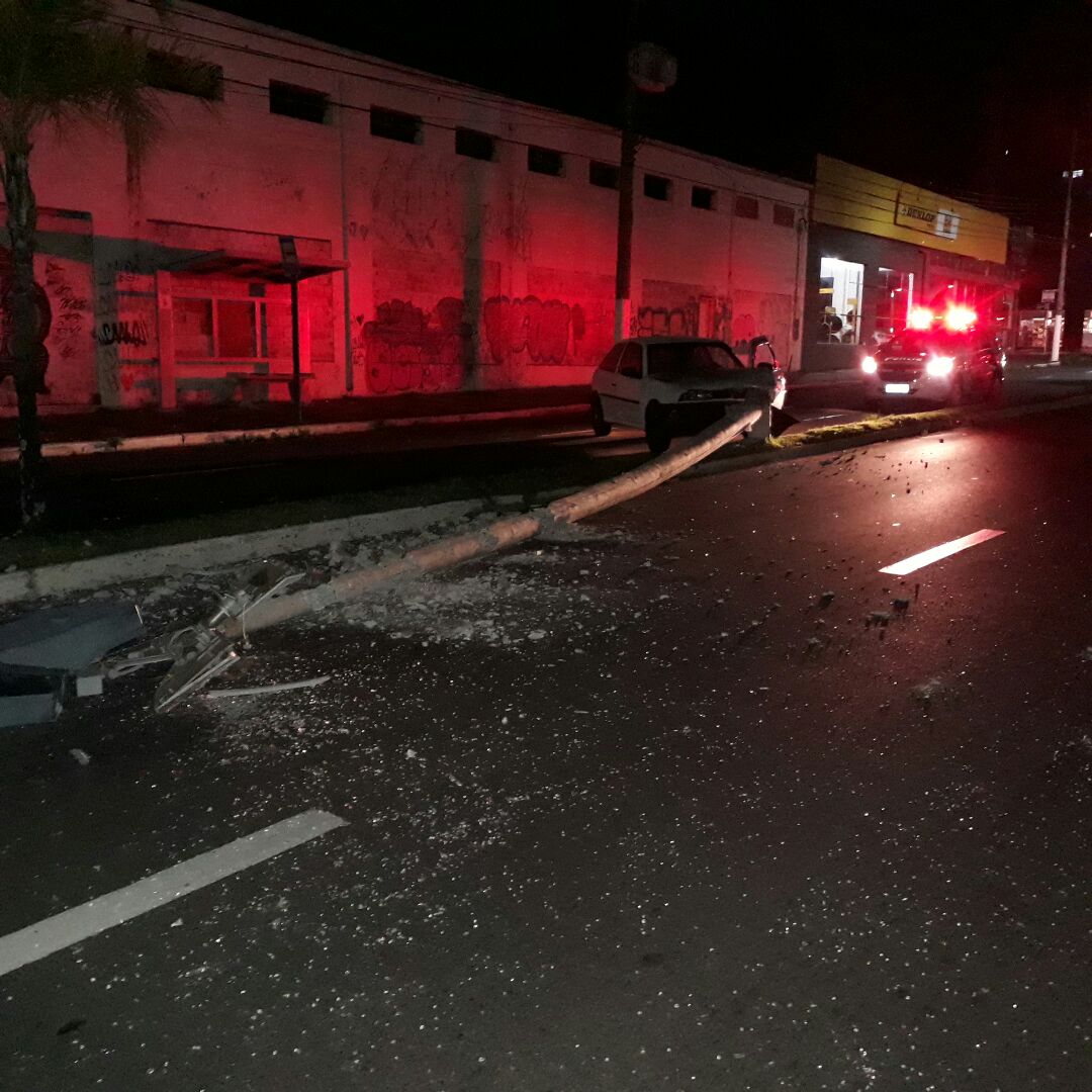 Um automóvel Volkswagen Gol derrubou um poste na avenida Tiradentes, no bairro Fragata, zona Sul de Marília, após colisão no começo da madrugada desta quinta-feira (23).